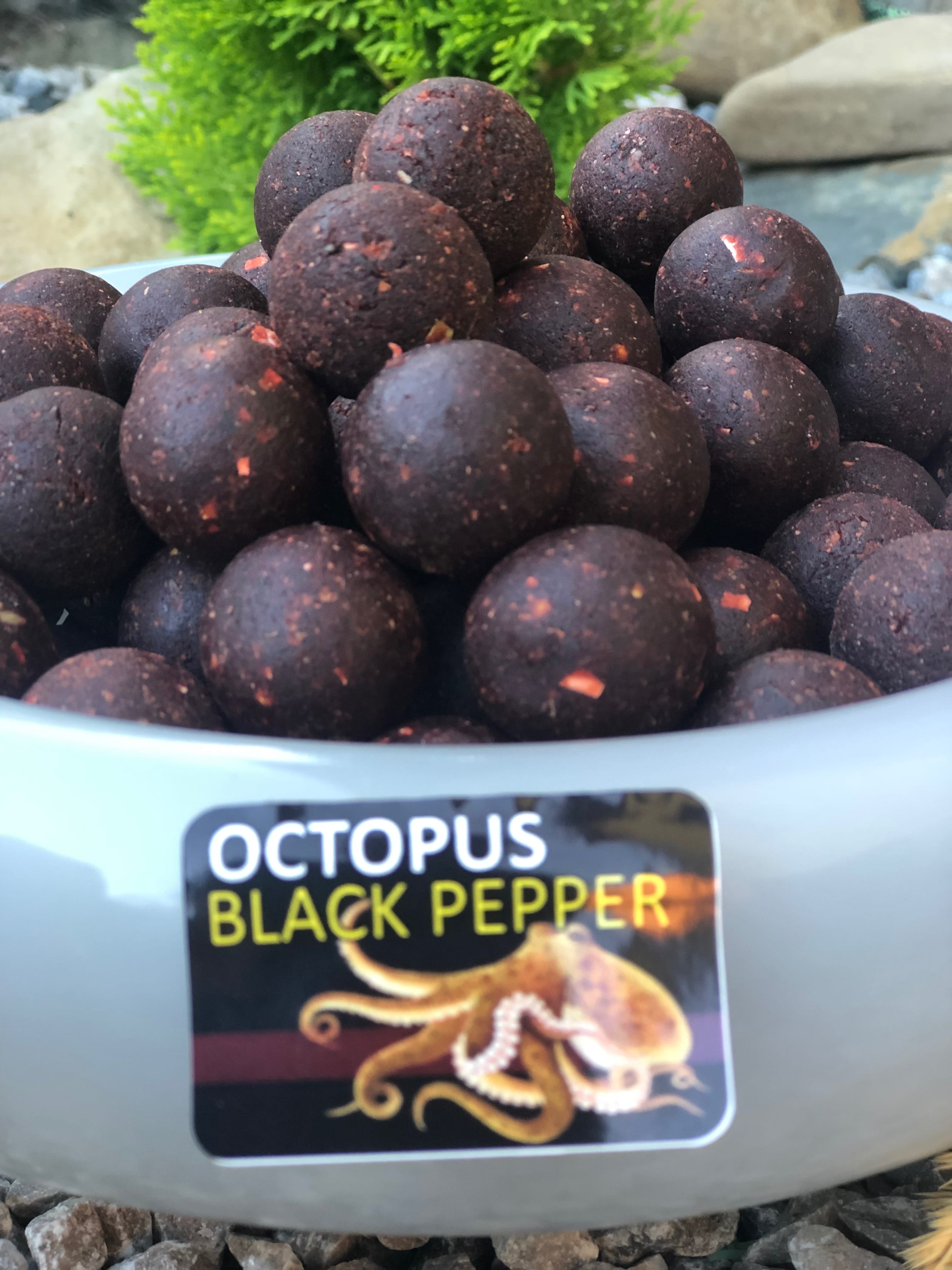 Бойли «OCTOPUS BLACK PEPPER» скатані на міксі, в основу якого входить борошно осьминога ,робін-ред та рибне борошно LT-94.Ізюминкою даних бойлів є яскраво виражений запах чорного перцю,що виступає як сильна принада а смак чорного перцю стимулює апетит у коропа,виступаючи своєрідним активатором кльову.