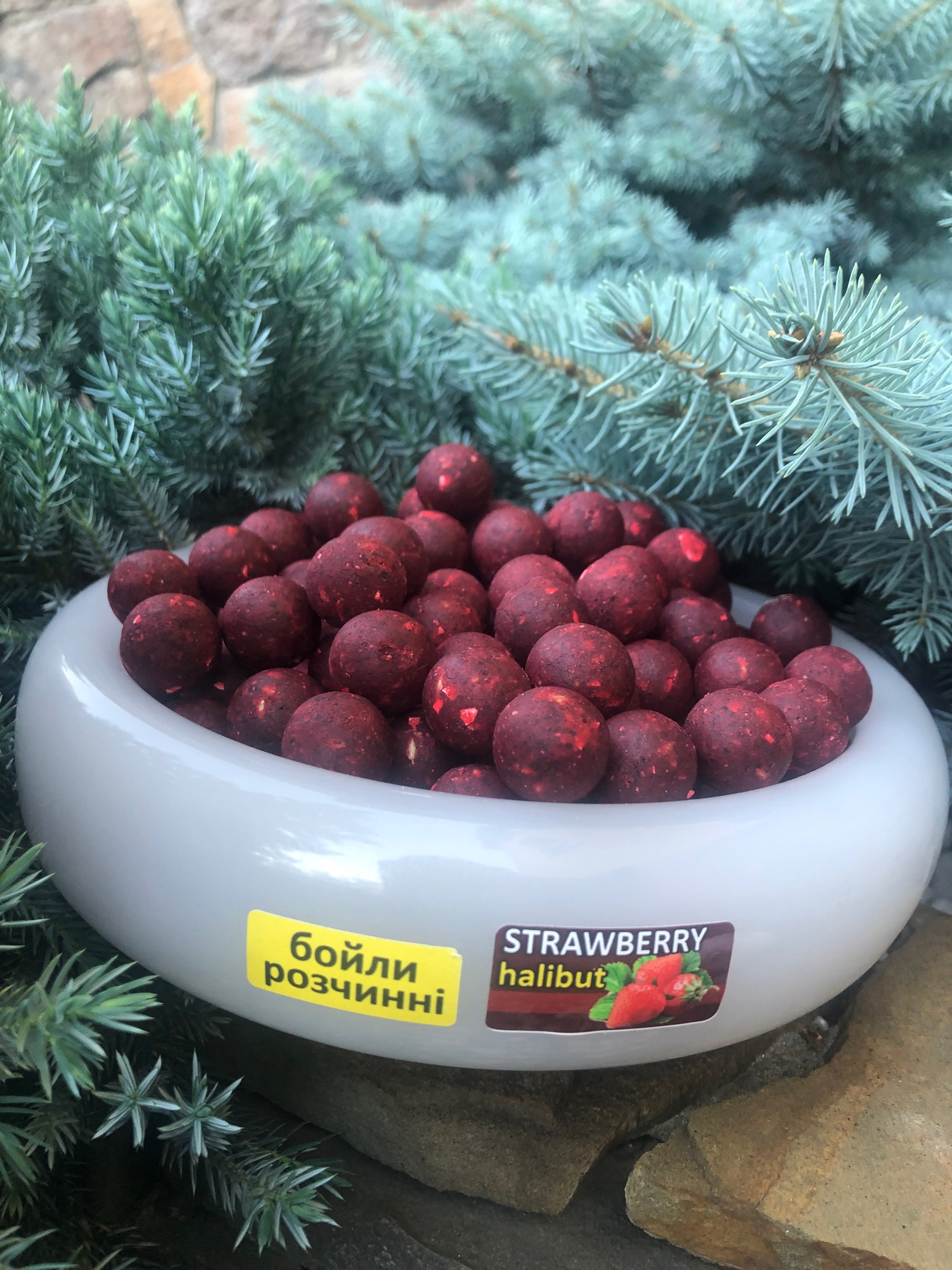 Бойли «Strawberry Halibut» скатані на міксі , в основу якого закладено рибне борошно LT-94 та інші інгредієнти рибного походження.Бойл має яскраво виражений рибний смак та запах,який гарно підкреслюється відтінком трускавки.